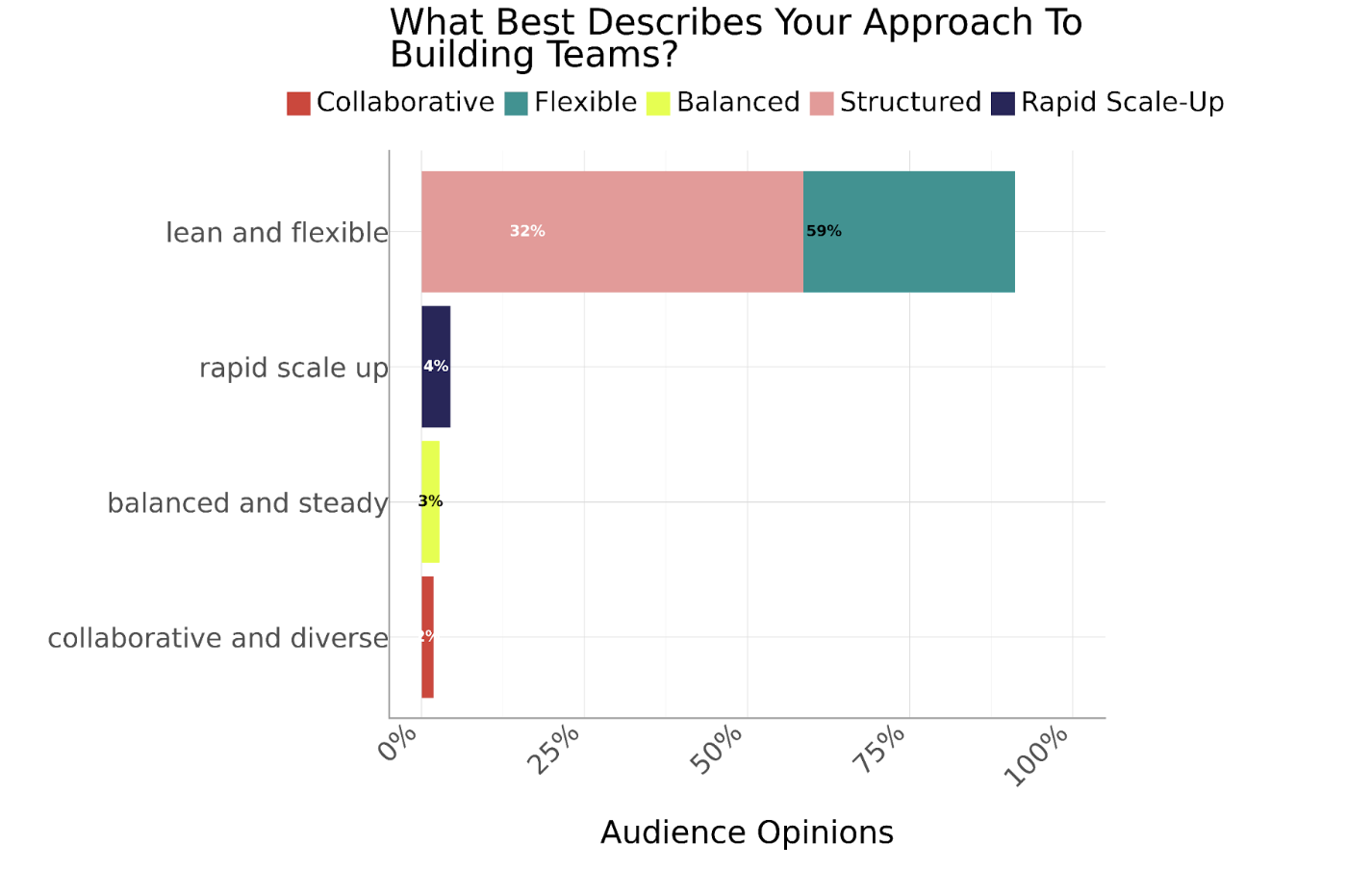 59% of tech leaders in startups all adopt the same best practices when growing their teams. They focus on being lean and flexible, while 32% of them take a more structured approach. In contrast, only 4% approach team building with a rapid scaling mindset, 3% with a balanced and steady approach, and 2% in a collaborative and diverse manner.