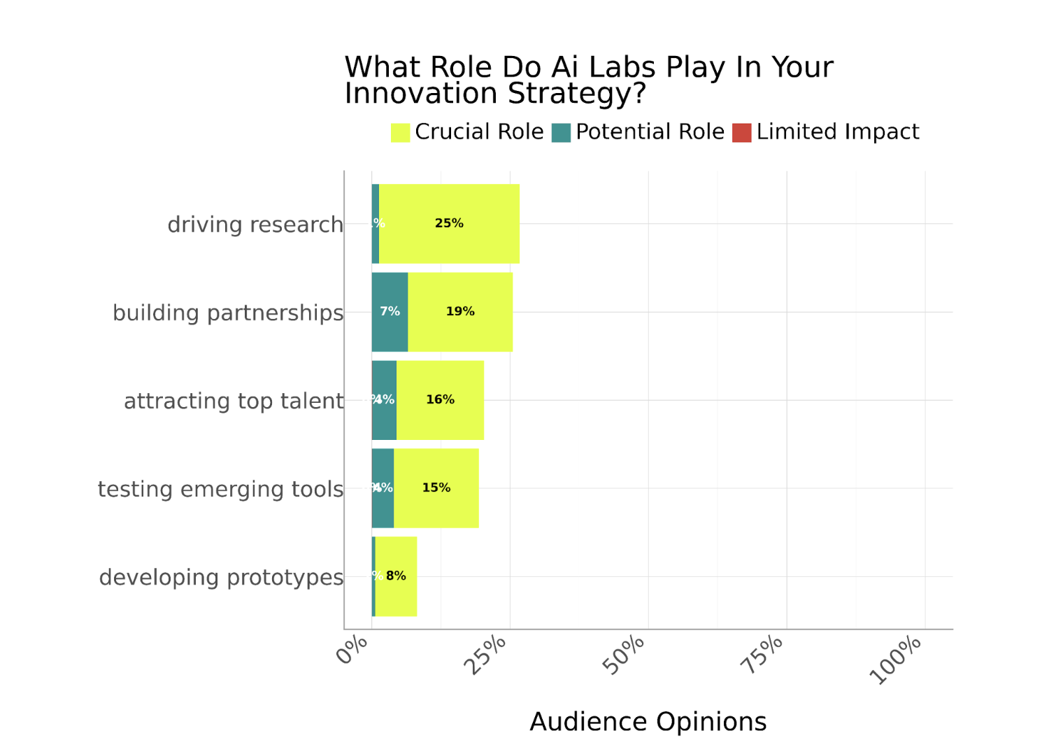 AI labs are playing an integral role in innovation strategies, and for our audience, they’re having a major impact in five different areas. The biggest is in driving research, with 25% saying these labs play a crucial role and 1% saying they will play a potential role. 19% and 7% feel the same about AI labs building partnerships, and 1% and 4% agree that it impacts attracting top talent.