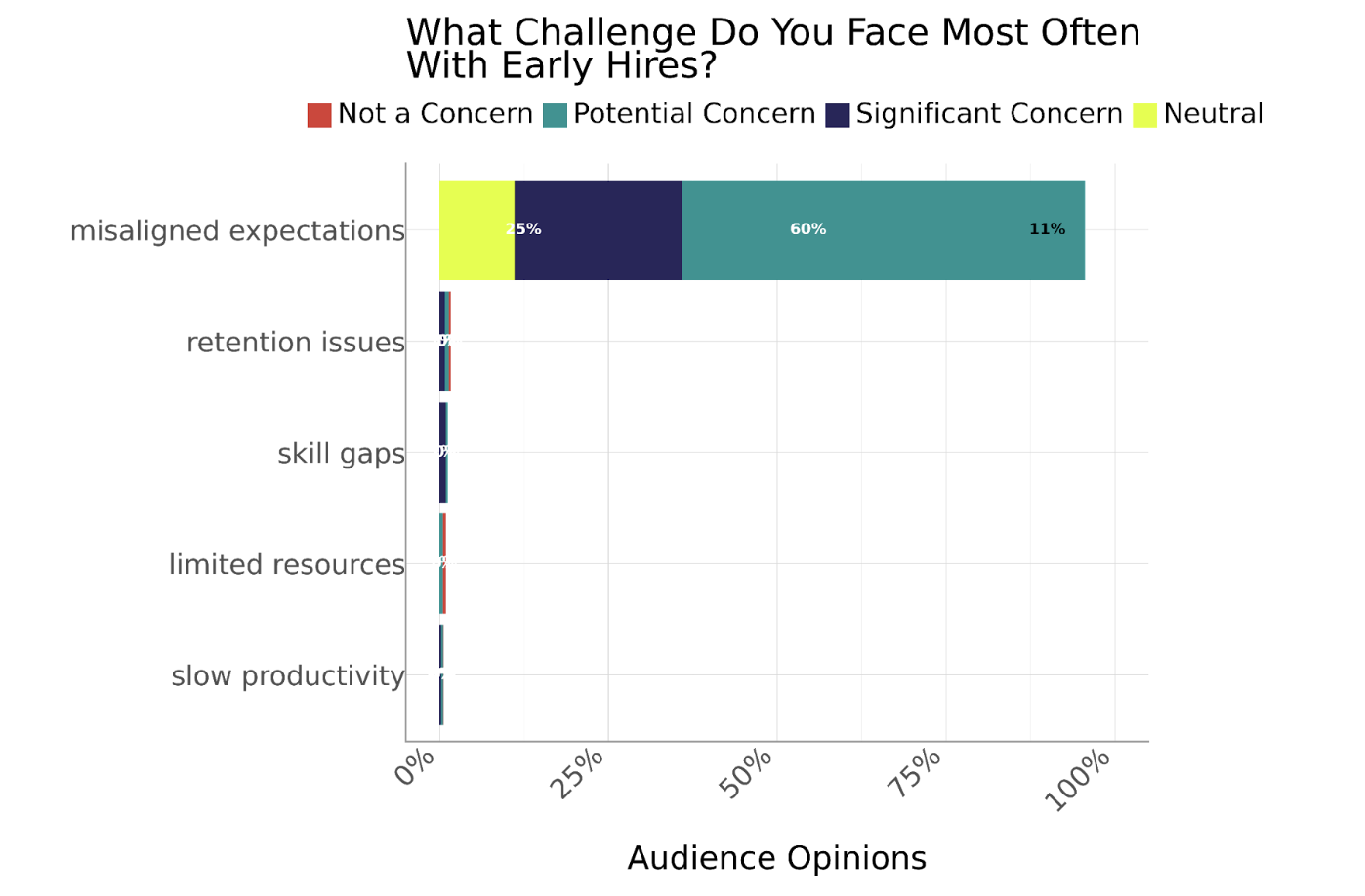 Misaligned expectations are the biggest and almost the only challenge our audience voices in connection with early hires. Opinions are split, with 60% saying this is a potential concern, 15% feeling neutral about it, and 11% stating that it's a significant concern.
