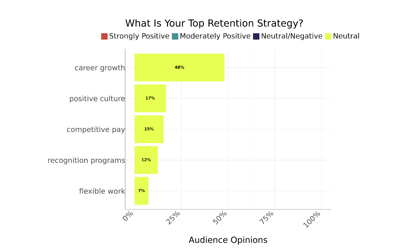 Nearly half (48%) mention career growth, while positive culture is mentioned by 17%, competitive pay by 15% and recognition programs by 12%.