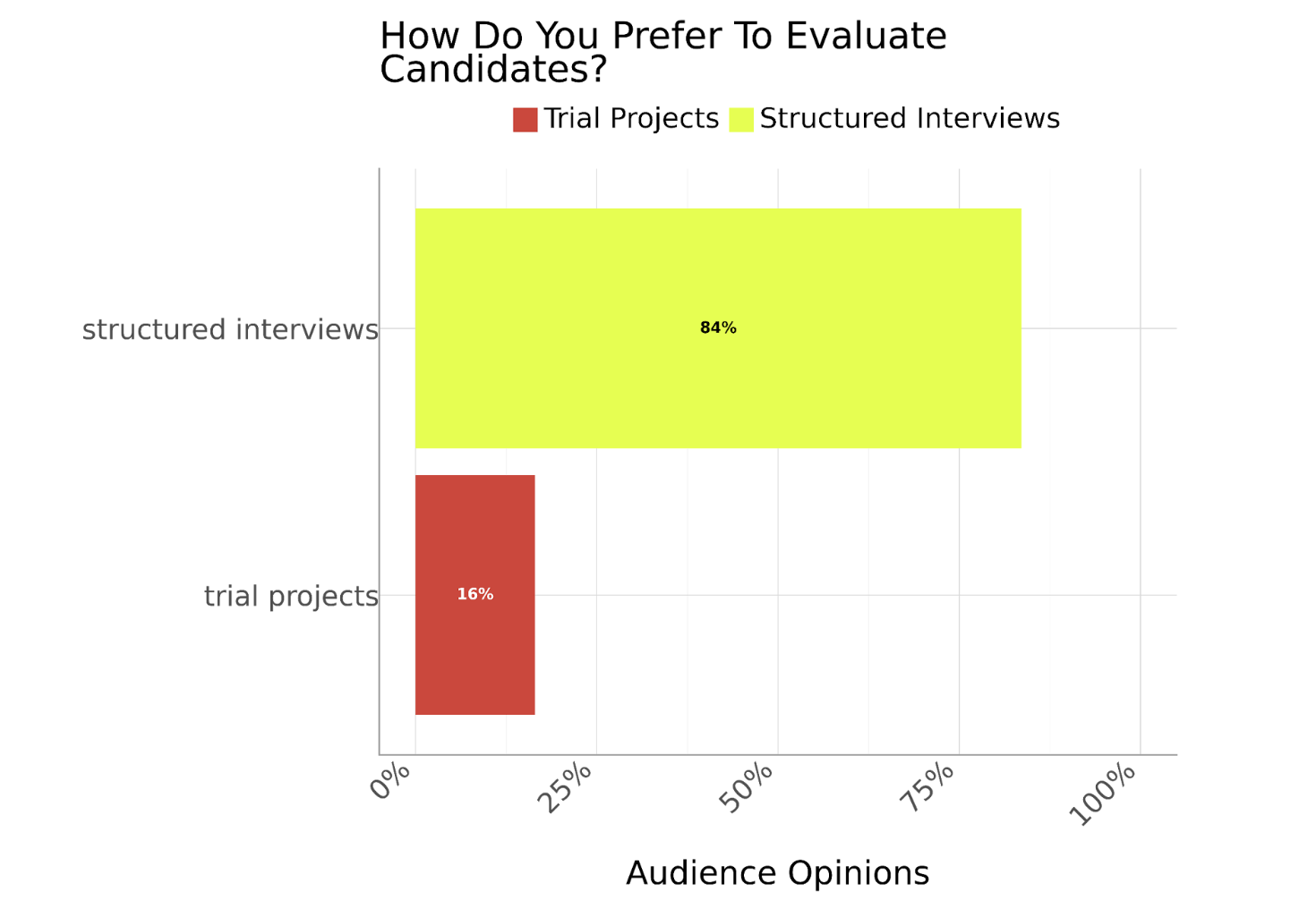 In comparison, 16% of our audience say that they prefer to evaluate candidates using trial projects, showing that there’s still room for practical, hands-on assessments that reveal real-world problem-solving abilities and on-the-job performance potential.